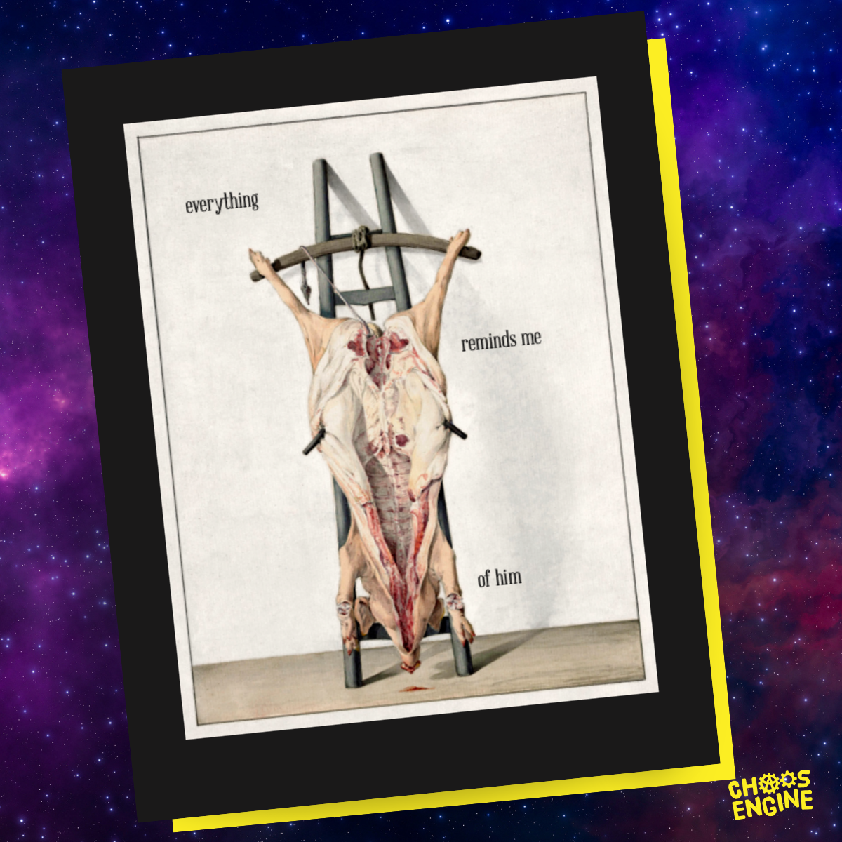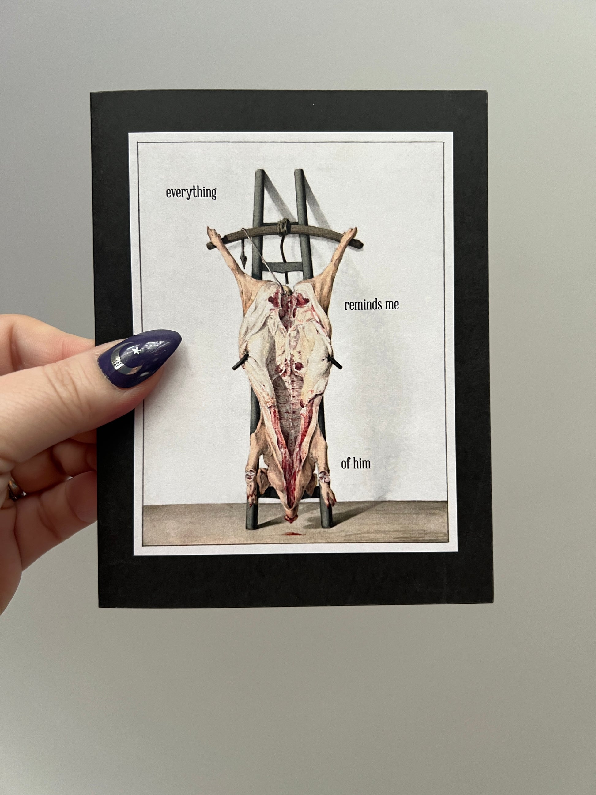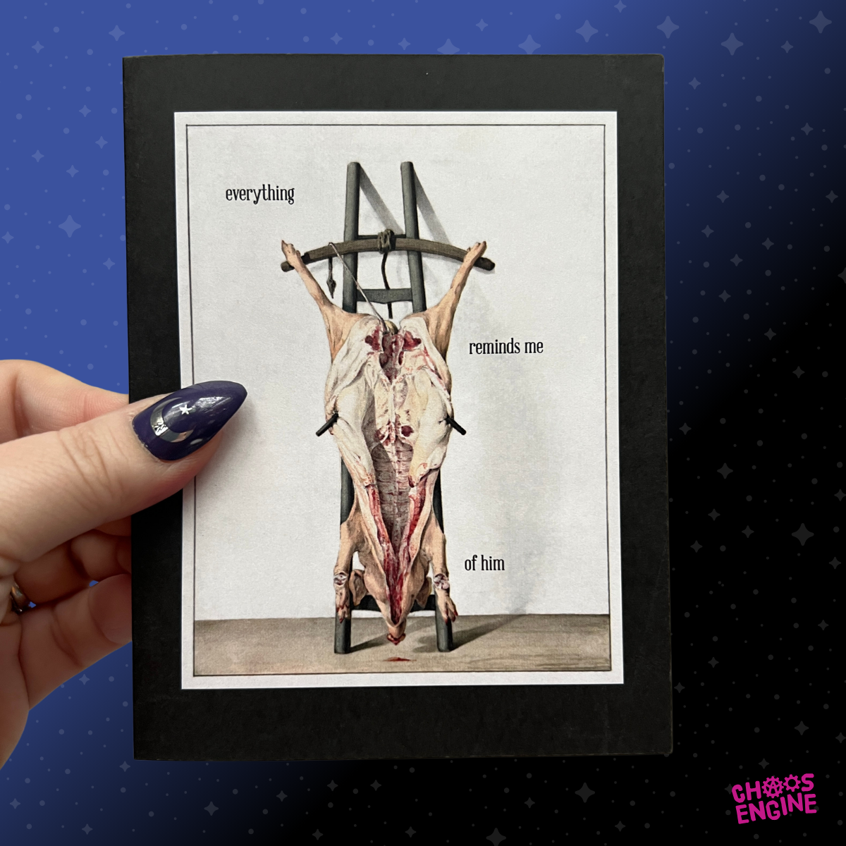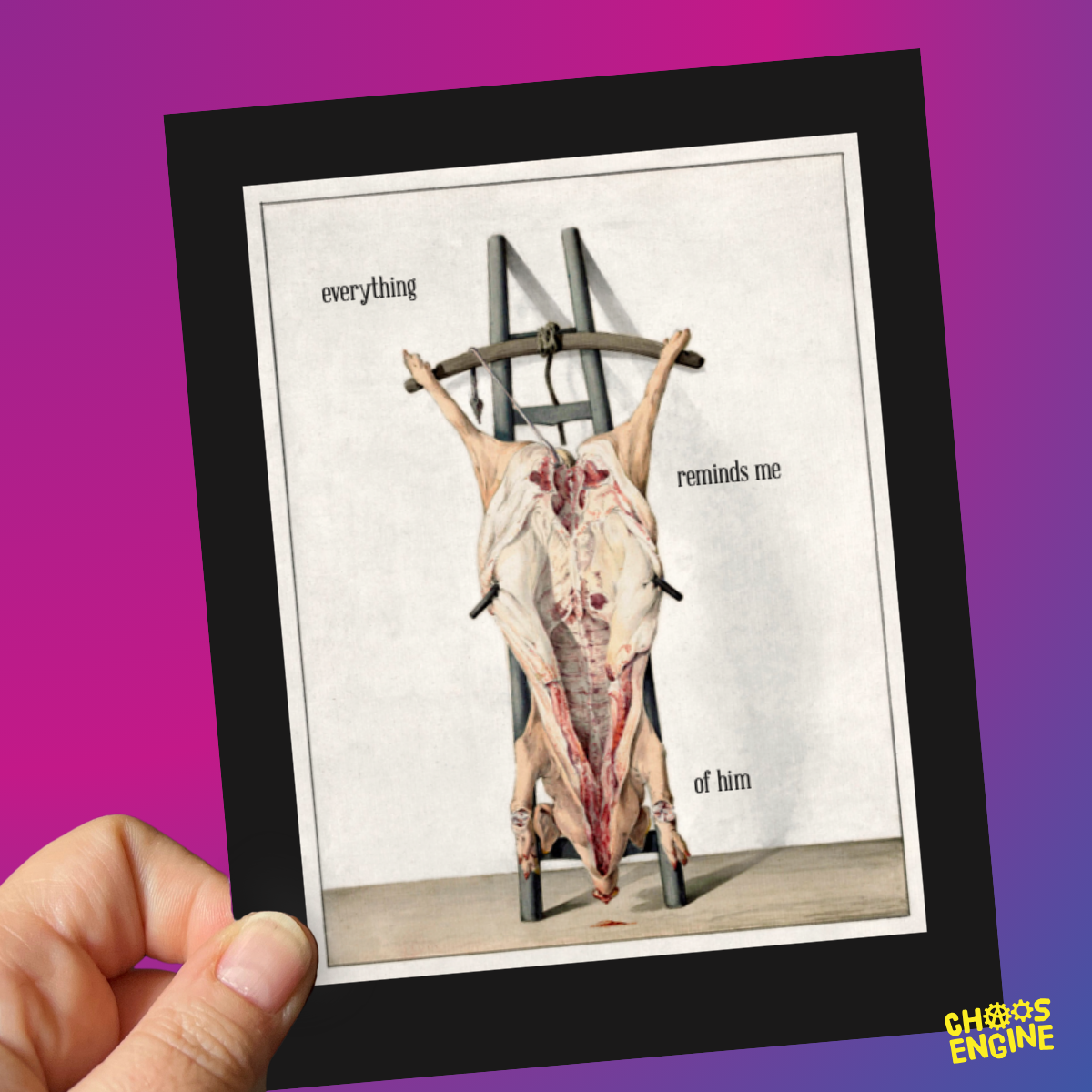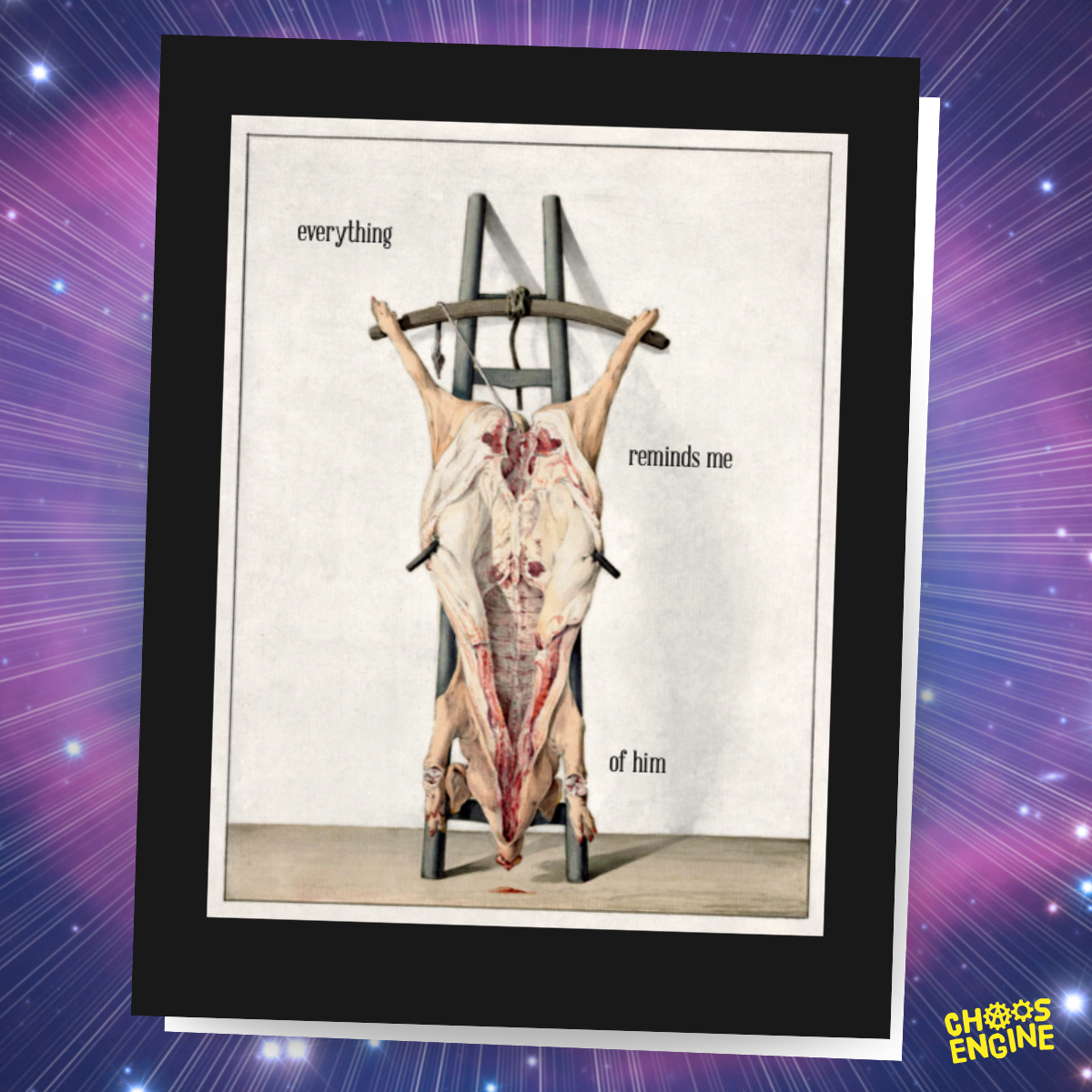 This card features a drawing of a dead pig (by Jean Bernard, taken from the public domain) that's been cut open and quartered upside down. Small text to the side says "everything reminds me of him."