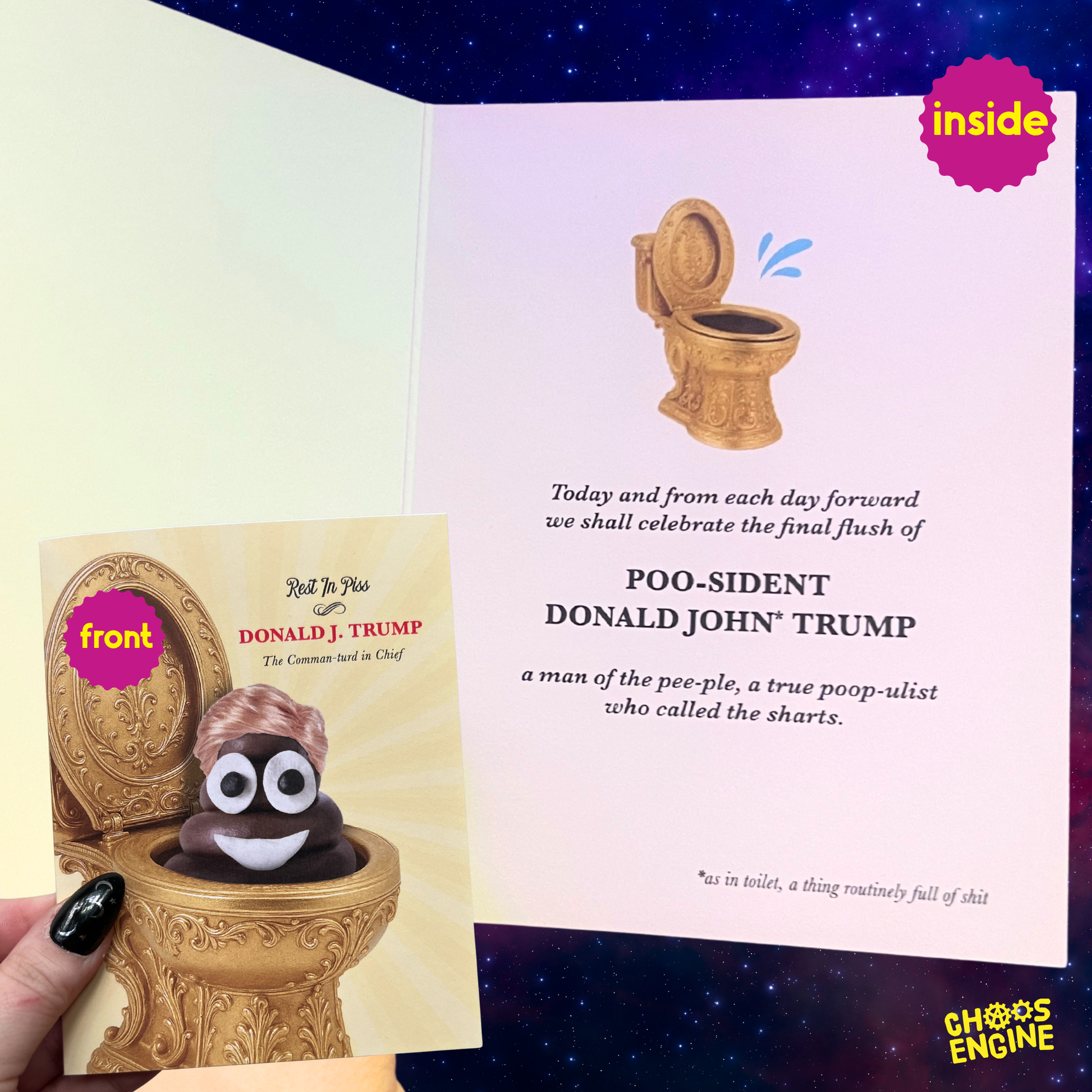 When Donald J. Trump kicks the (honey) bucket, we are all going to feel so relieved, like we took a massive collective shit. Celebrate flushing our embarrassing national turd with this rude, hilariously punny card when he finally dies!